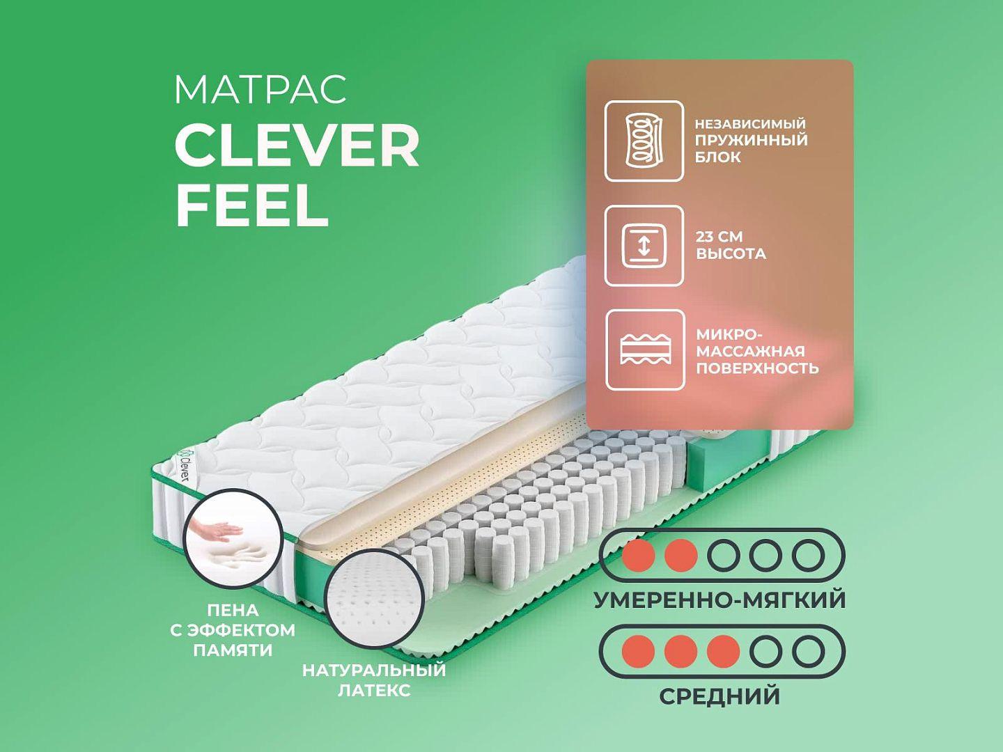 Фабрика Clever получила заслуженную репутацию, благодаря применению новых технологий и безупречному соблюдению стандартов качества. Clever Feel — образец продукта с лучшими характеристиками и доступной ценой, матрас создан из дышащих тканей, с эффектом вентиляции.