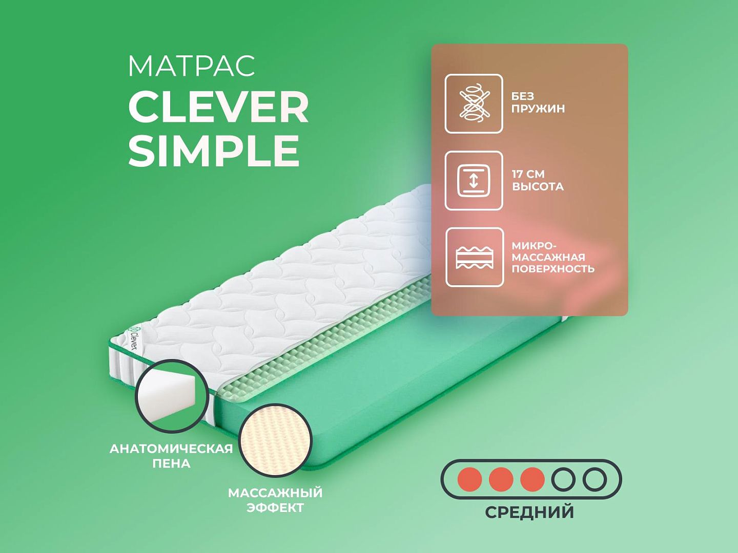 Фабрика Clever получила заслуженную репутацию, благодаря применению новых технологий и безупречному соблюдению стандартов качества. Clever Simple — образец продукта с лучшими характеристиками и доступной ценой, матрас создан из дышащих тканей, с эффектом вентиляции.