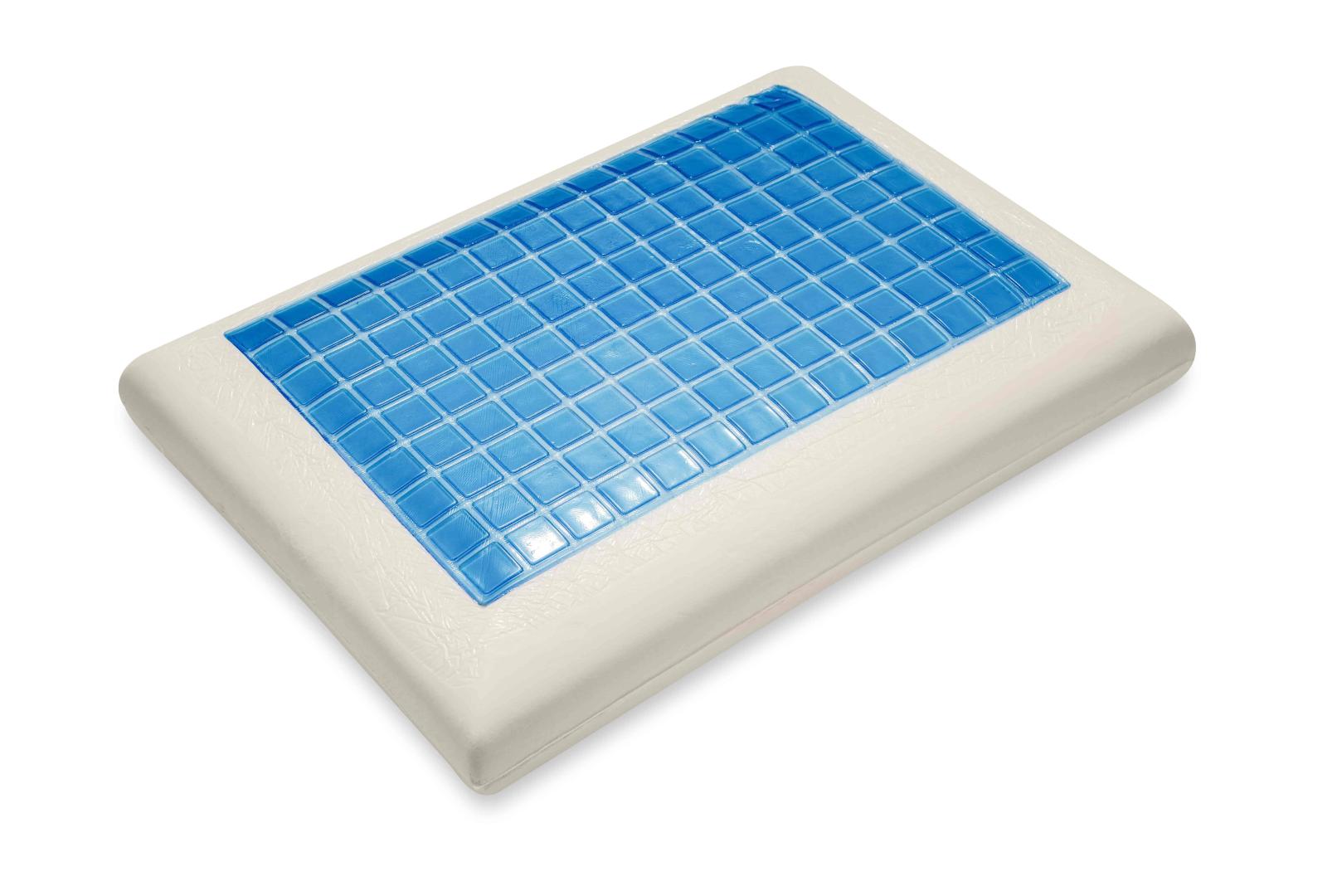 Анатомическая подушка стандартной прямоугольной формы. Наполнителем для данной подушки послужил материал мемори – пена с памятью формы, также использована прослойка охлаждающего геля.